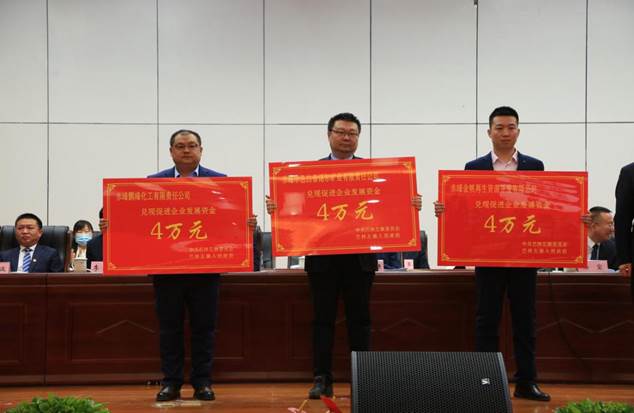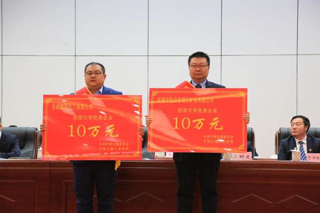 会议对巴林左旗招商引资项目及优惠政策进行了推介,表彰奖励巴林左旗2022年“优秀引资人”“招商引资优秀集体”“招商优秀企业”“招商引资优秀个人”,兑现招商引资政策和政府承诺资金。中色白矿荣获巴林左旗招商引资优秀企业,获得奖金10万元。同时,为奖励中色白矿2022年度工业增加值增速达到8%,并高出3个百分点以上,旗委旗政府兑现促进企业发展资金4万元,中色白矿党委副书记、总经理许进代表公司上台领取奖励。