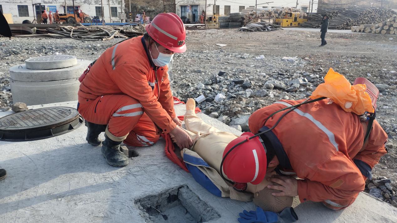 演练模拟在地表污水井管路维检时,两名检修工人未经受限空间作业审批、未配戴一氧化碳检测仪进入现场检修,检修前也未按要求通风,便直接进入污水井内,导致1名检修工人中毒晕倒在污水井内,同行工友紧急上报,值班领导迅速启动应急救援预案,按照现场勘测、伤员急救、隐患处置程序开展救援,顺利完成演练。